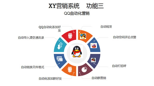 QQ自动化营销可以全自动运行“QQ自动群发信息”“自动导入清空通讯录”、“QQ自动化添加好友”、“自动打招呼”、“自动转发空间”、“自动空间评论”、“自动打招呼”、“自动添加群好友”、“自动群营销”。