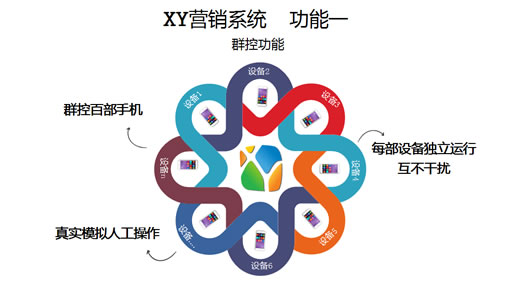 XY营销系统自带群控,可以群控多台营销手机,方便同一时间运行多种营销功能,最大限度的节省人工,节约公司运营成本,创造出最大的利润。