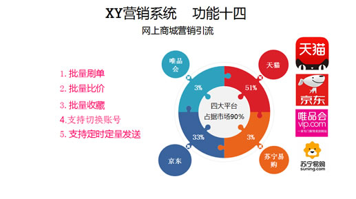 天猫、京东、淘宝、唯品会、苏宁易购、国美等。只要是网上商城类的平台,都能实现全自动营销引流。